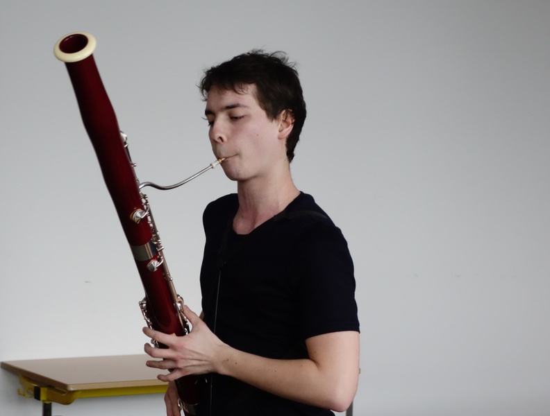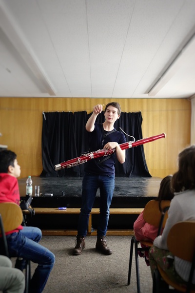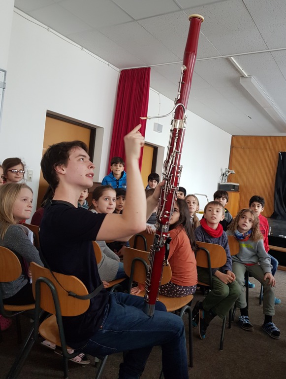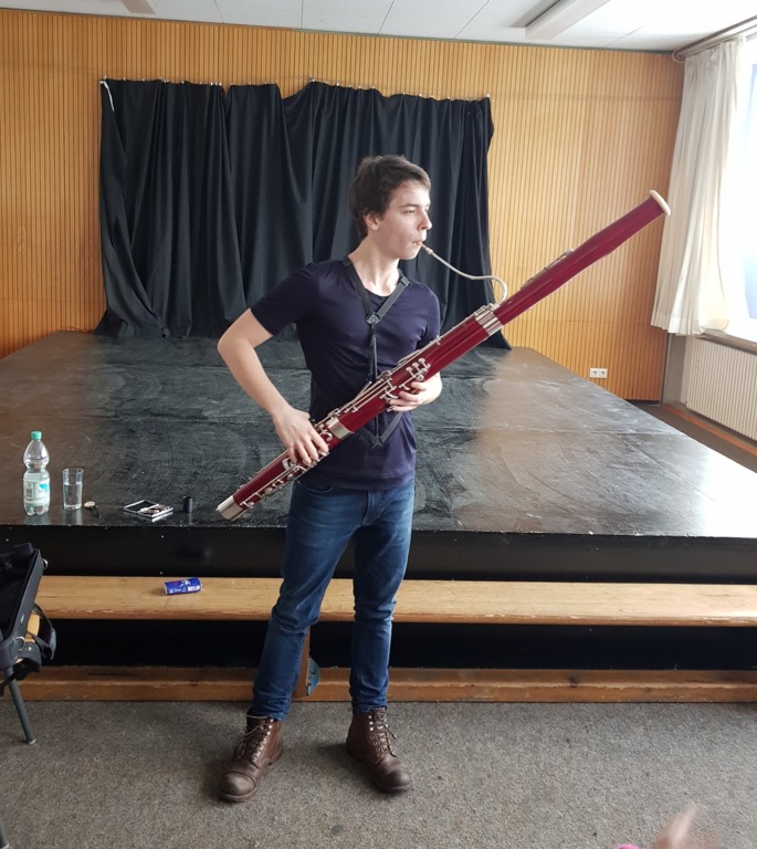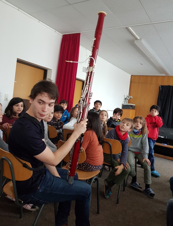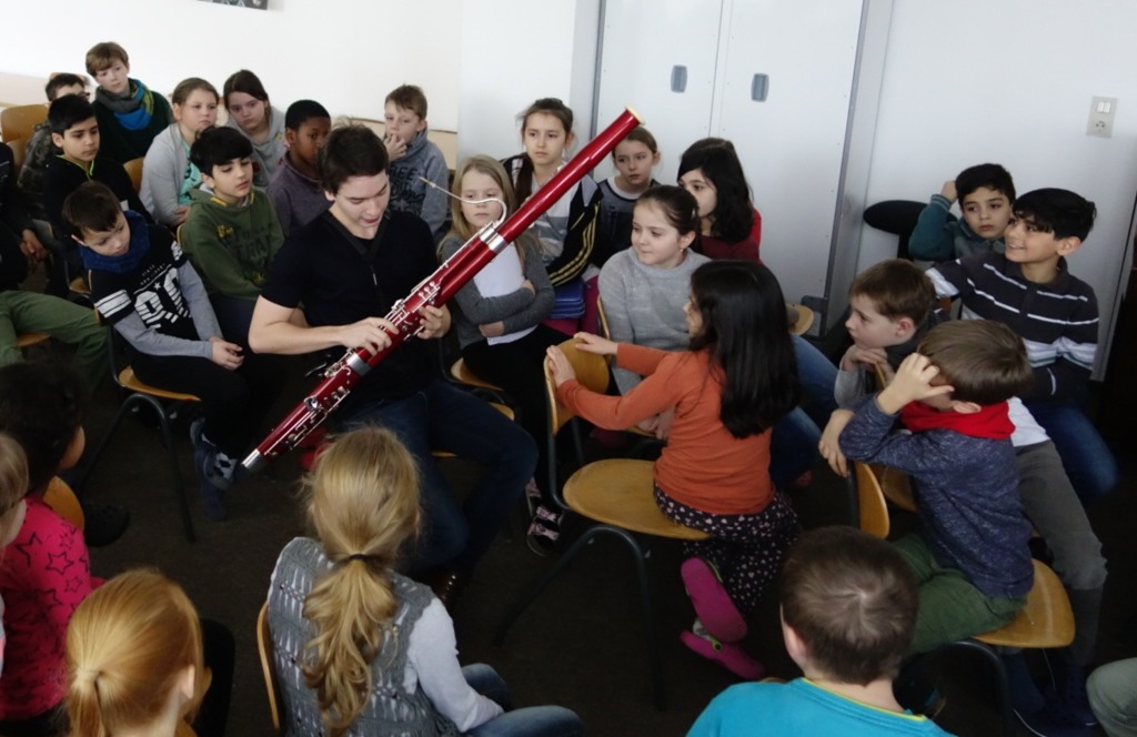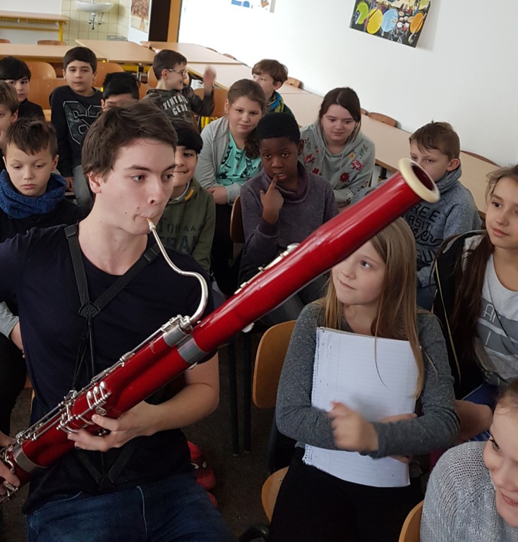 Der 23jährige Theo Plath, Fagottist u.a. im Saarländischen Rundfunkorchester, war am Montag, 05. Februar zu Gast in unserer Schule. Für drei Klassen stellte er das Fagott vor, gab zwischendurch kleine Kostproben seines Könnens und beantwortete geduldig alle Fragen (und Autogrammwünsche) der Kinder.