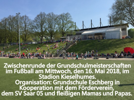Bei tollen äußeren Umständen (durchgängig strahlender Sonnenschein) fanden am Freitag, den 20. April, die 31. Grundschulmeisterschaften im Fußball statt. Unsere Grundschule Eschberg war voll dabei, als Ausrichter und auch als Mannschaft. So sahen die 250 Zuschauer im Stadion am Kieselhumes attraktive Spiele, wobei in der Gruppe A die Mannschaft der Grundschule Eschberg 1 mit drei Siegen und 29:1 Toren Gruppensieger wurde. Herzlichen Glückwunsch zum Gruppensieg und zum Erreichen der Zwischenrunde, die am 16. Mai 2018 stattfindet. In der Gruppe B wurde ebenfalls mit drei Siegen die Grundschule Saarbrücken-Ost Gruppensieger. Unsere 2. Mannschaft wehrte sich ebenfalls tapfer, konnte jedoch keinen Punkt heute ergattern. Dank des großen Einsatzes des Födervereins der Grundschule Eschberg und vieler fleißiger Mamas und Papas wurde der heutige Tag zu einem tollen Ereignis, der vielen Kindern sicher in bester Erinnerung bleiben wird. Weiter geht es mit der Zwischenrunde am 16. Mai 2018. Die GS Eschberg ist dabei!