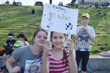 Sportplatz Kieselhumes. Damit die spielenden Kinder auch tatkräftig angefeuert werden, wird sich die Grundschule Eschberg geschlossen zu einem Wandertag aufmachen um die Klassenkameraden und Freunde